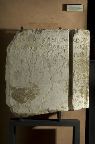 Lastra parallelepipeda/base di statua con iscrizione sulla fronte e profondo solco verticale sulla parte destra del pezzo.
