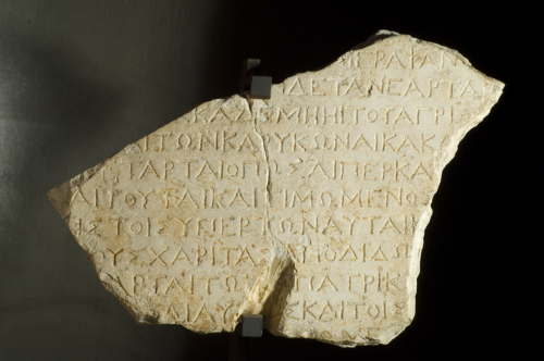 I caratteri epigrafici, quali i tratti esterni del sigma ancora divaricati, il terzo tratto del pi che non raggiunge completamente la base della lettera e l'omikron notevolmente rimpicciolito, consentono di attribuire il pezzo al medio ellenismo. Nonostante la frammentarietà del testo, vista la menzione di un personaggio, del padre e, probabilmente, dei suoi discendenti, sembra si tratti di un decreto onorario.