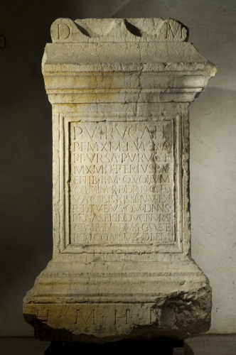 Questa iscrizione rende conto di una somma di denaro stanziata per la perpetuazione di omaggi funerari, con la particolare nota conclusiva secondo la quale il sepolcro doveva considerarsi esclusivo, e non poteva dunque essere trasmesso ai figli. Il lascito è disposto per il collegium nautarum Veronensium Arilicae, dai due fratelli dedicanti in memoria dei genitori. Questo collegio, che aveva sede a Peschiera, era costituito da Veronesi e, al pari del Collegium Nautarum Arilicensium, si occupava del transito di merci via lago e via fiume. Attestazioni relative ad analoghi collegi si hanno, per esempio, anche per Como, Mantua o Ticinum. Si segnala nel testo un costrutto arcaizzante, cibos ponendum, in r. 11, che testimonia il frequente ricorso a formule di questo tipo specie nel linguaggio giuridico, ancora all'epoca in cui fu posta l'iscrizione. Altro arcaismo è il secus in luogo di secundum, in r. 11. Quanto all'onomastica, "Virucate" ha riscontri in territorio ligure. Il latino di questa iscrizione non appare molto rigoroso, ma rende conto di usi correnti dal sec. III in poi nell'Italia settentrionale. Le osservazioni relative al lessico e alle fondazioni ricordate, inducono a collocare cronologicamente l'ara tra la seconda metà del sec. II d.C e il sec. III d.C. Per ulteriori ragguagli si rimanda alla bibliografia.