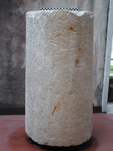 Il miliare, leggermente rastremato verso l'alto, presenta sulla faccia superiore tre incavi: quello centrale di forma tondeggiante, quelli laterali di forma quadrangolare e più profondi. La forte consunzione lapidea rende quasi evanida l'iscrizione. Si osservano, comunque, interpunzioni triangolari, lettere lievemente apicate e incise con solco a V. Ductus abbastanza regolare, modulo tendenzialmente quadrato.