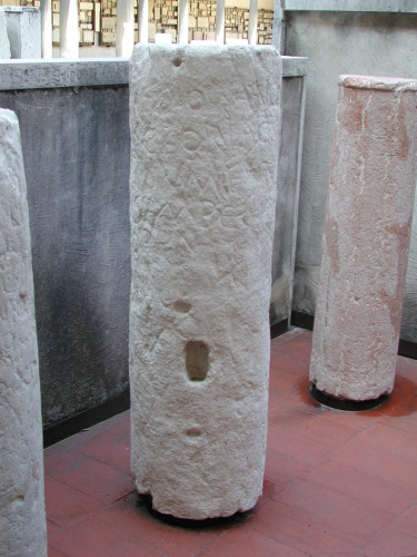Il miliare, lievemente rastremato verso l'alto, presenta delle cavità cieche in successione verticale nella porzione subito al di sotto dell'iscrizione: la cavità quadrata quadrata è profonda cm. 5. Le altre cavità sono tondeggianti. L'iscrizione, a causa della consunzione calcarea, risulta quasi evanida. Si notano comunque ductus e modulo abbastanza irregolari e lettere poco apicate, incise con solco a V.