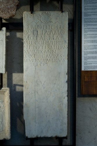La stele marmorea con acroteri ha la superficie levigata; la prima riga dell'iscrizione, D, M, è tra gli acroteri; in mezzo nella parte alta la corona stilizzata tracciata a compasso con solco sottile e poco profondo, con lunghe vitte, tipica dei pretoriani. Scritta con molta cura, i segni di interpunzione sono a triangolo; sono evidenti le linee guida.