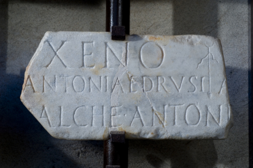 Il testo epigrafico integro si deve alledizione del Corpus nella quale si rende noto che il frammento marginale sinistro è conservato al Museo Lapidario Maffeiano mentre il frammento marginale destro fa parte della collezione privata dei Corsini a Firenze, nei Giardini. Pertanto si legge: Xeno, / Antoniae Drusi. // Statira, / Antoniae Drusi, l(ibertis). // Malche, Antoniae Drusi, l(ibertae).