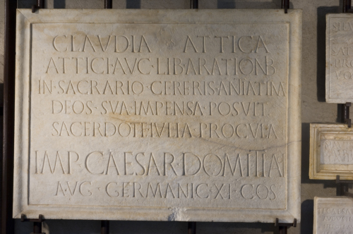 La lastra marmorea rettangolare ha la superficie levigata, lo specchio epigrafico è racchiuso in una cornice modanata a gola e listello. Le lettere, apicate, sono incise con cura, i segni di interpunzione sono a sagitta; in r. 1, tra CLAVDIA e ATTICA una foglia di edera. Apicature: in r. 2 O; in r. 3 A,O; in r. 6 I, A, O.