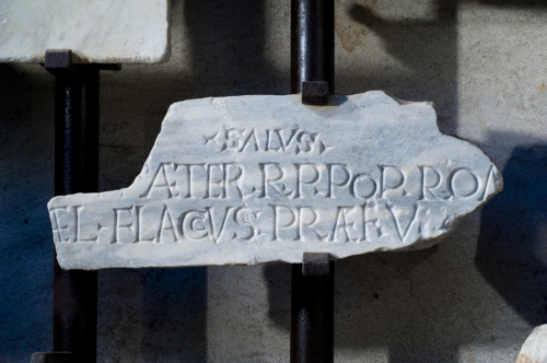Lastra rettangolare con lato lungo di base, spuria, con superficie della fronte lisciata, gradinata e poi levigata; il retro si presenta solo lisciato. Asimmetria nellimpaginazione e lettere incise con largo solco a sezione triangolare e pronunciate apicature. Si notano numerose abbreviazioni ed uso di nessi in r. 2 AE di AETER e in r. 3 AE di AEL(IUS) e AE di PRAEF(ECTUS) sebbene del secondo nesso è visibile solo una porzione superiore della prima asta verticale della A e una piccola porzione della traversa che allungata va a formare la cravatta della E. Uso di lettere nane: r. 2 O di POP(ULI) e r. 3 seconda C di FLACCUS incisa allinterno del semicerchio della prima C. Segni di interpunzione triangolari collocati in posizione irregolare, spesso alla base delle lettere.