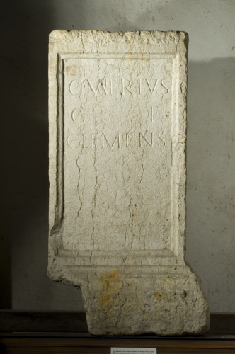 Ara con fusto quadrangolare. Al centro della faccia superiore, un incavo di forma circolare di cospicua grandezza (diametro cm. 27.5), la cui circonferenza è spezzata, verso il retro, da un'apertura a sezione rettangolare che tuttavia si limita alla sola faccia superiore e non prosegue in una scanalatura continua come sul lato sinistro dell'ara, fino all'attacco della zoccolatura. Lo specchio epigrafico è campito in una cornice a gola e listello e si raccorda all'alto zoccolo mediante una nuova cornice a gola e listello che prosegue anche sul lato destro, mentre a sinistra non ne è rimasta traccia e sul retro la lavorazione dello zoccolo è solo grossolana. Sul retro, inoltre, lo zoccolo è spezzato nella sua altezza da un'apetrura a sezione rettangolare, posizionata verso il margine destro dello zoccolo stesso. Tanto lo specchio epigrafico quanto le modanature risultano lavorati a martellina. Il retro risulta grossolanamente lavorato. Il lato destro e il lato sinistro sono lavorati a martellina, ma erosi e desquamati. Interpunzioni di forma triangolare con punta orientata verso lalto a sinistra. Ductus regolare e modulo tendenzialmente quadrato. Lettere apicate, incise abbastanza profondamente con solco a V. Tratti montanti della M molto divaricati. Si segnalano, non indicati dal CIL, un nesso in r. 1: la V e la A di Valerius hanno in comune rispettivamente lasta convergente destra e lasta montante sinistra, e una L nana, sempre in r. 1.