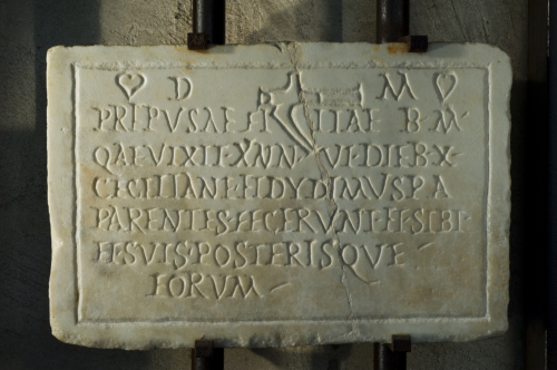 Asimmetria nellimpaginazione e lettere eseguite male, con evidenti apicature a becco e uncino: a volte A senza traversa; in r. 3 la A di ANN[OS] ha il punto di incrocio delle aste verticali talmente basso da sembrare una X; inoltre si noti, in r. 3, la mancanza della Q in QAE. In finale di r. 4 ripetizione iniziale della sillaba iniziale di PARENTES di r. 5, per errore del lapicida.