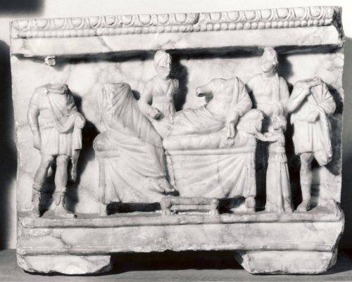 Cassa pseudoparallelepipeda con peducci, cornice formata da astragali, perline e listello, zoccolo a fascia tra due listelli; sulla fronte è rappresentata al centro una kline, sulla quale vi è una figura femminile recumbente, vestita con tunica e mantello, con braccio destro alzato e proteso verso un'altra figura maschile, completamente ammantata seduta sulla kline; dietro sporgono solo con il torso, due figura femminili con tunica; mentre alla destra della kline una bambina con le braccia protese ai cuscini della kline; ad entrambi i margini due figure maschili in corta tunica, mantello e calzari leggermente voltati verso il centro della scena