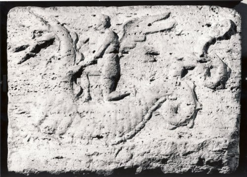 Fronte rettangolare, zoccolo a listello aggettante; al centro è reppresentato un ippocampo che nuota da destra, sulla cui schiena è inginocchiata una figura maschile alata con braccia protese in avanti ad appoggiarsi al collo dell'essere mostruoso.