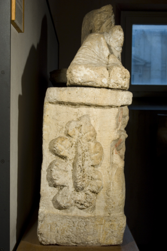 Cassa: parallelepipeda con peducci; zoccolo costituito da listello, cornice da listello e toro; sulla fronte è rappresentata al centro una figura femminile alata vestita con tunica e copricapo, seduta su un masso, regge con entrambe le mani una fiaccola ardente; ai lati disposti in modo simmetrico due figure maschili voltate verso l'estrno ma con il viso rivolto al centro, nudi con corto mantello e copricapo, tengono entrambe lo scudo verso l'estrno; Sui finachi della cassa sono rappresentate foglie di acanto con nervatura centrale in rilievo.