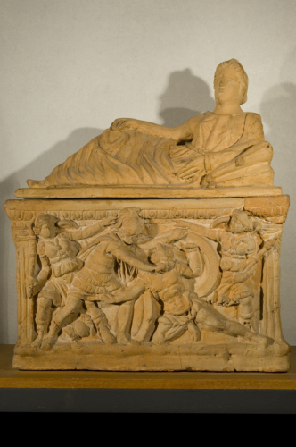Cassa: parallelepipeda apoda; zoccolo a fascia e listello, cornice a listello ed astragali; lo spazio rappresentativo è inquadrato da due colonne scanalate, al centro due figure maschili in combattimento, quella di sinistra è rappresentata stante, vestita con corta tunica, affonda la lama nel collo dell'avversario e con l'altra mano ne tiene lo scudo, la figura di destra in ginicchio, vestita con corta tunica e armatura, affonda la lama nel ventre dell'avversario mentre con l'altra mano regge lo scudo a protezione delle spalle; ai lati delle due figure centrali due figure femminili alate che impugnano una fiaccola.