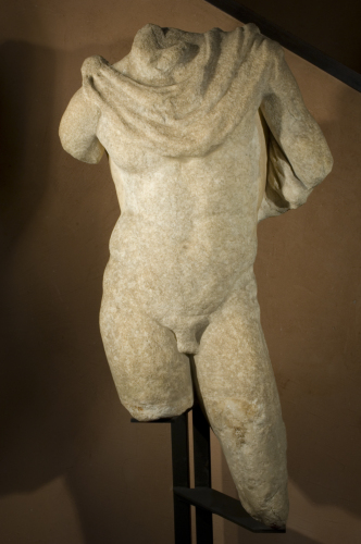 Statua maschile a tutto tondo, raffigurante un uomo in piedi e nudo, con la clamide fermata sulla spalla, che copre la spalla sinistra e metà della schiena. Sul gluteo destro si notano le tracce della mano destra, che vi si appoggiava.