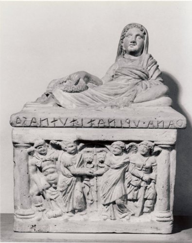 Il coperchio di quest'urna fa parte di una tipologia molto frequente, anche se in questo caso presenta alcune varianti, poichè raffigura una donna velata, che regge in mano una ghirlanda e con le dita mostra il classico gesto apotropaico. Si può ipotizzare, senza certezza, che la produzione sia dalle officine chiusine, fra la seconda metà del III secolo a.C. e il I secolo a.C. Questi prodotti probabilmente erano destinati alla società medio-bassa, che non poteva permettersi prodotti più raffinati. Per motivi stilistici può essere datata intorno alla seconda metà del II secolo a.C.