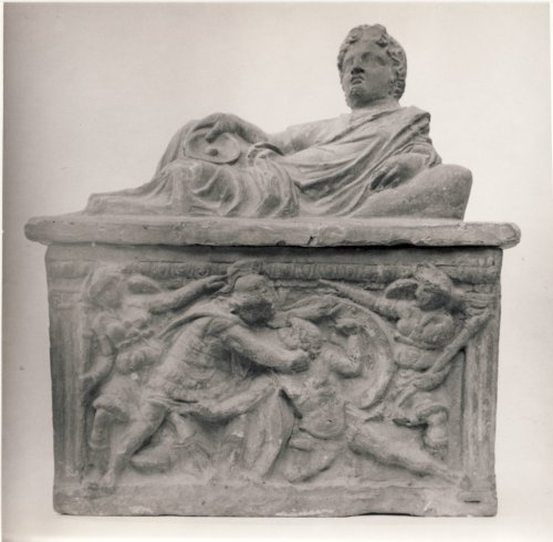 Urna cineraria a cassetta, apoda, con coperchio, sopra il quale si trova una figura maschile. L'uomo è raffigurato sdraiato, vestito con una tunica senza maniche, e un mantello che copre le gambe, il dorso, la spalla e il braccio sinistro e che forma pieghe tripartite sull'addome. I capelli a ciocche sono raccolti da una fascia. Si appoggia sul gomito sinistro sopra un cuscino, mentre il braccio destro è disteso lungo il corpo. La mano destra regge una patera ombelicata. Sul fronte della cassa, circondato da una cornice a listello, si trova invece una scena ad altorilievo che rappresenta un duello fra due figure maschili, che si affrontano al centro della scena, fra due demoni femminili alati che impugnano la fiaccola. La figura a destra è caduta in ginocchio e affonda la spada nel ventre dell'uomo a sinistra, che con la mano destra immerge la sua spada nella gola del primo, e con la sinistra regge lo scudo con il quale l'altro si protegge. Ai lati due pilastri scanalati incorniciano la scena, mentre al di sopra si trova un astragalo dentellato. Sono ancora visibili tracce di ingubbiatura sia sul coperchio sia sulla cassa. E' inoltre presente un'iscrizione in lingua etrusca sul listello superiore del fronte.