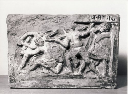 L'urna, realizzata a stampo, proviene dalle officine di Chiusi, vista anche la materia prima utilizzata. Il motivo iconografico raffigura il mito di Echetlo, contadino che combatte nella battaglia di Maratona contro tre guerrieri, armato solo con un aratro. Questo tema, molto diffuso nel II secolo a.C., può essere collegato anche con il periodo delle lotte sociali del II secolo a.C. che si svolsero in Etruria. Ci sono state parecchie difficoltà nel riunire insieme le casse e i loro rispettivi coperchi. Infatti quest'urna deve essere collegata, come giustamente raffigurato nel Museum Veronense, al coperchio che invece è stato erroneamente attribuito al n. inv. 28710, sia nel primo allestimento del Museo Maffeiano, sia nella pubblicazione di Modonesi del 1995. Quest'urna quindi è dotata di coperchio.