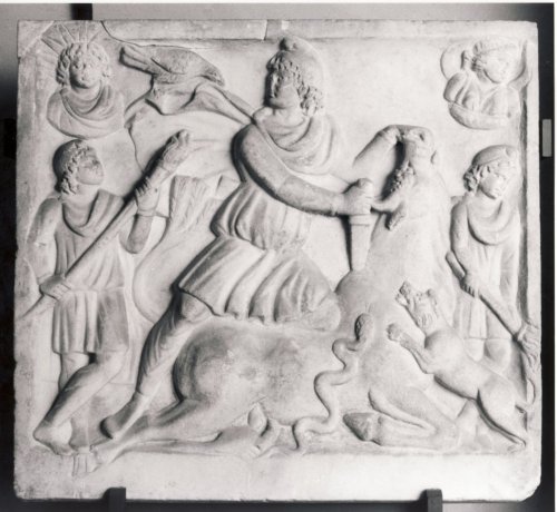 Rilievo di forma quadrangolare, con rilievo racchiuso all'interno di una cornice a listello. La scena rappresenta un taurobolio, con al centro una figura maschile, vestita con una tunica, dei calzoni e una clamide svolazzante, mentre in testa porta un berretto frigio. Ha il capo volto verso destra, per ricevere dal corvo, messaggero del Sole, l'ordine di uccidere l'animale. Con la mano sinistra solleva all'indietro la testa del toro, tenendolo per le narici, mentre la mano destra affonda nel fianco dell'animale un coltello. Il toro è accosciato e l'uomo lo tiene fermo puntandogli sopra il ginocchio sinistro. Dal corpo dell'animale moribondo nascono tutte le specie vegetali, rappresentate dalle tre spighe con cui la coda del toro termina. Sotto l'animale, uno scorpione e un serpente, cercano di divorare il ventre del toro e di bere il suo sangue. Un cane invece veglia davanti alla scena. Ai lati si trovano due porta-fiaccole, a sinistra uno tiene la fiaccola sollevata, a rappresentare il sorgere del Sole, che si trova nell'angolo superiore sinistro, a destra l'altro tiene la fiaccola abbassata a simboleggiarne il tramonto, rappresentato nell'angolo superiore destro.