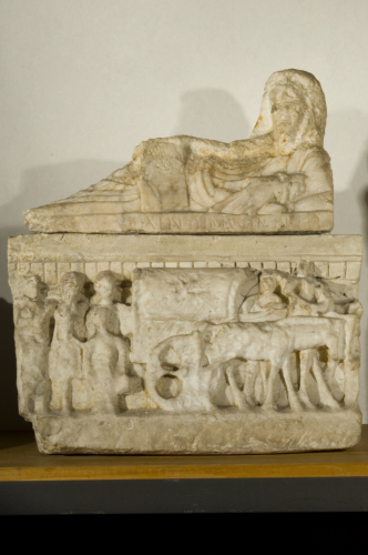 Cassa: parallelepipeda apoda; la cornice è composta da listello sagomato, toro e dentelli; lo zoccolo è composto da fascia compresa tra due listelli; sulla fronte è raffigurato un carpento trainato da una coppia di muli, con defunto recumbente sporgente con il busto; il telone del carro occupa parte della cornice; a sinistra quattro figure, una di dimensioni minori; a destra dietro i muli una figura, forse un cavaliere.