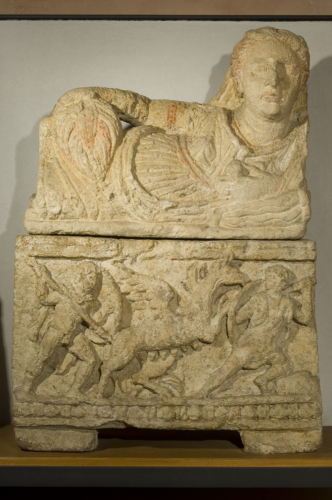 Cassa: parallelepipeda su quattro peducci non decorati, coronata da listello e con zoccolo a fascia delimitata da due listelli e decorata a kyma ionico. Sulla fronte a bassorievo un grifo alato dalle molte mammelle, in posizione di attacco, con le zampe sulle scudo della figura di destra che con l'altra mano brandisce una spada; a sinistra altra figura maschile, nuda con mantello, con lancia e scudo.