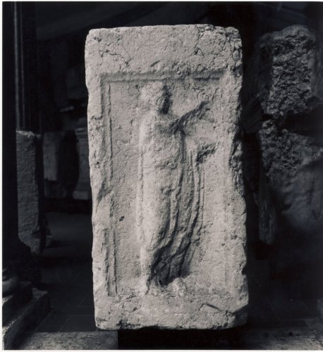 Cippo funerario, di forma parallelepipeda, con un rilievo, all'interno di una cornice a listello e gola, che rappresenta una figura maschile in piedi, vestita con una doppia veste, rivolta verso sinistra, che tende entrambe le braccia verso sinistra, sollevando un oggetto, probabilmente identificabile come un lituus. Il peso del corpo poggia sulla gamba sinistra, la destra è leggermente flessa.