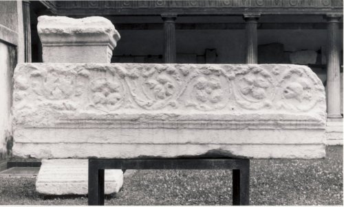 Frammento di fregio architettonico, di forma parallelepipeda, con architrave sotto il rilievo decorativo di motivi vegetali formati da girali d'acanto contenenti fiori a quattro petali.
