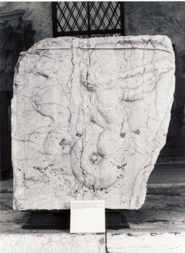 Trapezoforo di forma parallelepipeda, sostegno di una mensa funeraria, con un rilievo all'interno di una cornice semplice, raffigurante una essere marino fantastico, metà uomo metà pesce, in atto di suonare soffiando all'interno di una conchiglia.