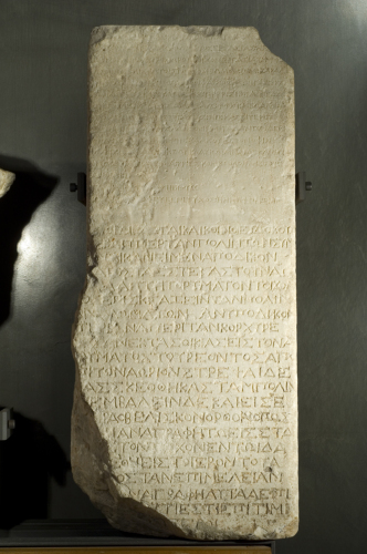 B: I caratteri di questa iscrizione sono più evoluti di quella precedente: il sigma ha i tratti esterni paralleli, il tratto orizzontale del pi sporge dai due lati, l'omega non è più rimpicciolito, sebbene lo sia ancora l'omikron. Queste particolarità inducono a ritenere questo testo posteriore di circa un secolo rispetto all'altro. In esso si registra una sentenza emessa dai giudici ordinari con l'assenso degli arbitri scelti dai contendenti e dei difensori degli interessi pubblici riguardo ad un conflitto economico fra la città e il cittadino Soterion. Costui, come si deduce dal testo, assicurava lo scolo delle acque dalla sua casa al mare attraverso canali che attraversavano l'arsenale; l'acqua piovana, poi, cadeva sul tetto di quest'ultimo edificio. Poichè esso aveva subito dei danni, la città chiese che fosse Soterion a risarcirli. I giudici, però, diedero ragione al privato, imponendo che fosse la città stessa ad eseguire i lavori di riparazione. La sentenza iscritta sulla lapide venne posta sotto il nume tutelare della divinità del santuario. E' il Venturi a fornire ulteriori notizie interessanti: egli ricorda che la lastra giunge al Maffei da Venezia per il tramite del cavaliere Mocenigo e si trova a Verona dal 1716. Presumibilmente il Mocenigo a cui fa riferimento il Venturi è Alvise III (1662-1732), "capitano da mar" e poi doge dal 1722 al 1732. Costui fu al seguito di Francesco Morosini durante la riconquista della Morea e con buona probabilità entrò in possesso dell'iscrizione in oggetto tra la fine del Seicento e gli inizi del Settecento. Appare rilevante ricordare, peraltro, che l'assedio dei Turchi a Corfù avviene nel 1715, probabile terminus ante quem per l'arrivo del pezzo a Venezia. Venturi, oltre a ciò, avanza un'importante ipotesi circa la provenienza del pezzo: egli ricorda come nel 1823 vennero effettuati scavi a Corfù presso il sito di Cardacchio, durante i quali si ritrovarono le fondamenta di un tempio ionico esastilo dotato ancora di colonne in situ e alcuni pozzi nelle vicinanze. All'epoca la lastra in oggetto venne immediatamente riferita a questo santuario, sebbene non si potessero avanzare con certezza ipotesi circa la divinità cui esso era consacrato. Ciononostante si ritiene che, considerata la menzione delle sorgenti e degli apprestamenti idraulici, presumibilmente si tratti di Asclepio, in considerazione anche della menzione del serpente bronzeo che compare in un'iscrizione coeva rinvenuta presso il santuario di Asclepio a Delo.