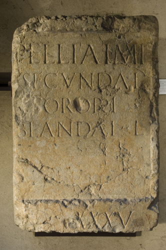Nella trascrizione del Corpus si propone quale unica formula anteposta al numerale XXXV, "in agr(o)p(edes)", ma si ritiene opportuno indicare, almeno in alternativa, anche la formula "in fr(onte) p(edes)", consueta nella tradizione epigrafica delle sepolture, considerando soprattutto il fatto che quest'ultima formula era generalmente scritta per prima. Si propone una datazione al sec. I d.C. per paleografia e per il gusto arcaizzante delle uscite in -i.