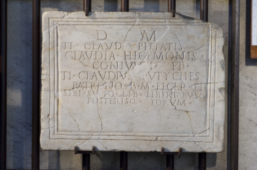 Lastra funeraria quadrangolare ricomposta con specchio epigrafico delimitato da cornice modanata a cavetto e listello, ricavato con semplice solco continuo.