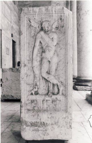 Il cippo probabilmente faceva parte di un monumento funerario a recinto, del quale costituiva uno dei limiti angolari. Il rilievo è di produzione locale, appartenente ad un gruppo di rilievi delle officine veronesi, databili all'epoca imperiale, raffiguranti eroti alati e aventi tutti la stessa forma.