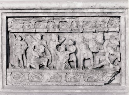 La scena è raffigurata sulla fronte ad altorilievo, delimitata in alto da una cornice formata da un listello con ovoli e un attico sostenuto da dieci mensole decorate sulla fronte da aquile con le ali semispiegate, mentre negli intervalli sono rappresentate teste di Gorgone alternate a rosette;in basso invece è ornata da uno zoccolo delimitato da due file di perline e formato da sei pilastrini alternati a sei archetti perlinati entro i quali sono inserite anatrelle affrontate a due a due. La scena rappresenta due uomini in lotta, morenti. All'angolo sinistro si trova un demone alato che volge il capo verso destra e nella mano destra tiene la fiaccola rovesciata. A fianco del demone si trova il primo personaggio maschile, ferito, che è caduto a terra e si appoggia ad uno scudo circolare puntato a terra, mentre dietro lo sorregge un guerriero in tunica e corto mantello, appoggiandogli la mano destra sulla spalla. Al centro stanno una figura femminile, ammantata, in movimento, con lo sguardo rivolto verso destra e con il braccio sinistro alzato, e una figura di uomo anziano, inginocchiato, ritratto di prospetto, barbato e con una tunica a maniche lunghe e mantello, con il capo ornato da un alto copricapo con diadema, il braccio destro levato e il sinistro che sorregge le pieghe del mantello. Lo affianca un giovane servitore in tunica corta. A destra del servitore, un guerriero con uno scudo rotondo decorato, con al centro una testa di gorgone che richiama quelle della cornice. A destra, a terra, il secondo personaggio in lotta, ferito, caduto sopra lo scudo con il capo reclinato sul petto, che con entrambe le mani tiene la spada. Dietro di lui un guerriero, di cui si scorge solo il tronco, cerca di sorreggerlo. Fra i due guerrieri dietro il personaggio disteso a terra, si trova una figura maschile barbata con alto diadema. Sullo sfondo sono visibili delle mura di città.