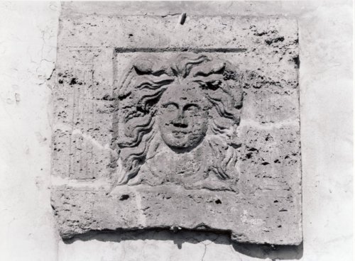 La fronte dell'urna presenta una testa in bassorilievo, racchiusa dentro un riquadro. Ai lati del riquadro si trovano due pilastri scanalati con capitello a foglia di acanto. La testa presenta sopra il capo due alette e un nodo di serpenti. Il volto ovale è incorniciato dai capelli disposti a ciocche corpose.