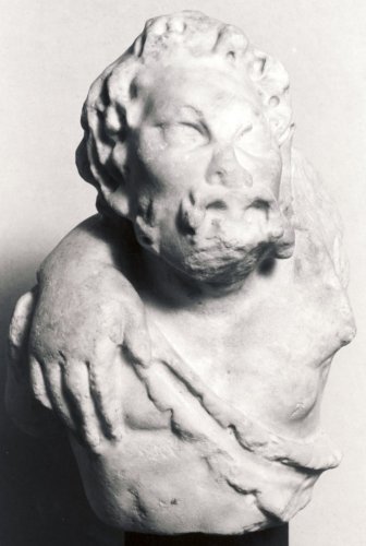 Il satiro è raffigurato a torso nudo con una pelle di animale a tracolla; il viso, dai tratti maturi, è caratterizzato da barba e baffi e da grandi occhi inespressivi; porta i folti ed ondulati capelli in modo naturale e lunghi fino sotto le orecchie. Una grande mano si appoggia sulla spalla destra del Satiro, mentre il braccio gli passa dietro la testa.