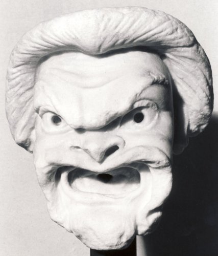 Maschera comica, rilievo a tutto tondo, bocca spalancata e pupille forate