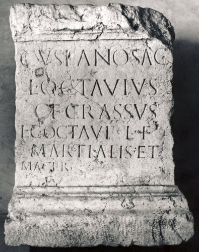 Non sono chiare la natura, l'origine e le competenze del dio Cuslanus ma certamente non si tratta di una divinità romana o ad essa riconducibile: il nome, nè latino nè greco, non ha permesso di avvalorare nessuna delle ipotesi avanzate quanto alla provenienza celtica, retica, venetica o etrusca del dio. La teoria maggiormente accreditata è comunque quella di una provenienza etrusca della divinità (per le diverse ipotesi relative alla provenienza del dio Cuslano si veda la bibliografia di riferimento). L'iscrizione si data alla I metà del I secolo d.C. sulla base di criteri paleografici e del contesto di rinvenimento.