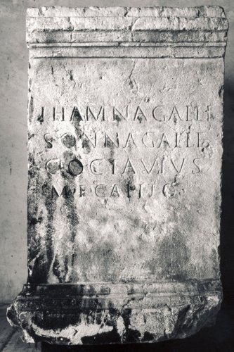 Il dedicante C. Octavius Capito è menzionato anche in CIL V, 3926 (n. inv. 28323). Le divinità destinatarie della dedica, Ihamnagalle e Sqnnagalle, sono probabilmente da considerarsi come personificazioni di elementi geografici della zona, protettori di particolari aspetti della vita del pago (pagus Arusnatium). Potrebbero costituire anche i nomi indigeni delle divinita del Sole e della Luna, in Cisalpina oggetto di dedica comune solo da parte degli Arusnati. Il ricordo di questo antico culto di origine probabilmente celtica, in particolare quello di Ihamnagalle, si conserverebbe oggi nel toponimo Ingannapoltron. L'iscrizione si data al I secolo d.C. sulla base di criteri paleografici, del contesto di rinvenimento e dal confronto con l'iscrizione riportata in CIL V, 3926 (n. inv. 28323) che menziona il dedicante C. Octavius Capito. La datazione è confermata da Franzoni, Bassignano, Modonesi.