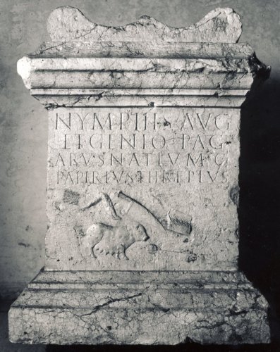 In relazione al personaggio menzionato come dedicante si veda anche CIL V, 3906. Quanto alle divinità a cui l'ara è dedicata, le Nymphae sono considerate personificazioni delle forze naturali che presiedono alla fecondità ed alla crescita, legate in particolare al culto delle acque e qui qualificate con l'appellativo Augustae; il Genius del pagus degli Arusnati è una divinità locale con funzione tutelare. L'iscrizione si data al II secolo d.C. sulla base di criteri paleografici, dell'apparato decorativo impiegato e per il contesto di rinvenimento: secondo Buonopane, infatti, l'ara è opera di una bottega epigrafica attiva a San Giorgio di Valpolicella tra la metà del I secolo d.C. e la I metà del II secolo d.C. Si consideri inoltre che Bassignano conferma la datazione al II secolo d.C. e Modonesi precisa agli inizi del II secolo d.C.