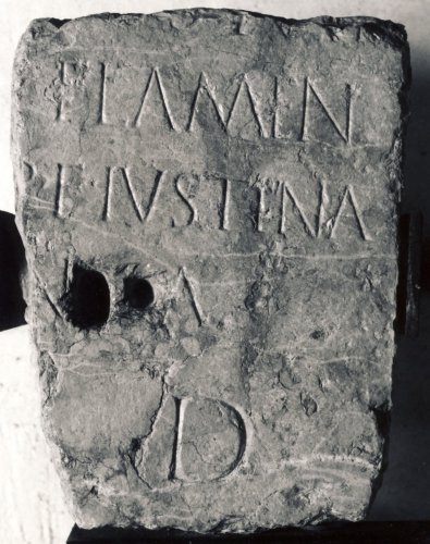 Il testo iscritto nel frammento angolare inferiore sinistro, attualmente conservato presso la pieve di S. Giorgio di Valpolicella, infisso nel muro dell'ambulacro, che va a completare parte dell'iscrizione, è riportato in CIL V, 3923. Il testo noto risulta pertanto: ------ / [---]S M I? / [Firmus] flamen / [et Cassia] P(ubli) f(ilia) Iustina / [flami]n[ic]a / [d(onum)] d(edit). L'iscrizione si data alla seconda metà del I secolo d.c. sulla base di criteri paleografici; la datazione è confermata da Buonopane che considera il monumento una produzione di un'officina epigrafica attiva a S. Giorgio di Valpolicella tra la metà del I e la metà del II secolo d.C.