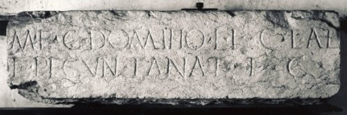L'iscrizione ricorda alcuni personaggi (curatores fanorum) che sovrintesero a una costruzione fatta con la pecunia fanatica, cioè con il denaro della cassa di un tempio, non precisamente identificato (forse quello di Minerva), nella quale confluivano i proventi delle vendite e dell'affitto dei beni del tempio, le quote pagate dai sacerdoti una volta assunta la carica e le offerte dei fedeli (a questo proposito si veda BASSIGNANO 1987, p. 361). L'iscrizione è stata datata tra la seconda metà del I sec. a.C. e la prima metà del I d.C. da Bertolazzi.