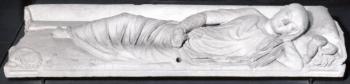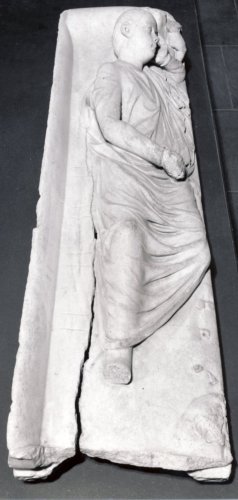 sul coperchio è rappresentato un giovane dormiente sdraiato su lettino, vestito con tunica e toga, poggia la testa su due cuscini e porta il braccio sinstro ripiegato con la mano sotto la testa, mentre il destro è disteso lungo il corpo; la mano reggeva in origine una corona (perduta). Nell'angolo anteriore destro sta rannicchiato un Eros con cornucopia tra le mani ed inginocchiato su un cuscino. Nell'angolo anteriore destro era rappresentato un cagnolino.