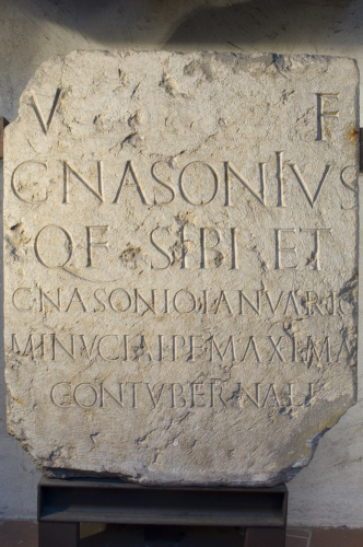 La formula onomastica della defunta Minucia Maxima è espressa in caso dativo con desinenza arcaica in -ai. L'iscrizione si data alla I metà del I secolo d.C. sulla base di criteri paleografici (modulo tendenzialmente quadrato), della presenza di una formula onomastica bimembre, priva di cognomen, per il dedicante e titolare della sepoltura, C. Nasonius e per l'impiego della desinenza arcaica in -ai nell'onomastica femminile.