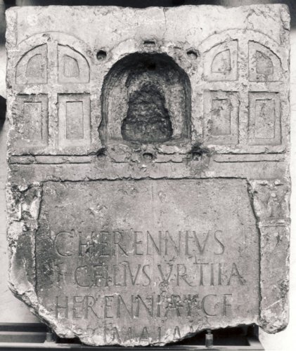 Per l'integrazione alla r. 4 m[atri] si veda CIL V, 3637: considerando l'iscrizione e la tipologia dell'apparato decorativo l'integrazione si ritiene valida. L'iscrizione si data alla II metà del I secolo d.C. sulla base di criteri paleografici e dell'apparato decorativo impiegato.