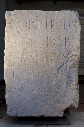 La presenza di un incavo rettangolare sulla superficie superiore della base e l'iscrizione che menziona solamente il destinatario, L. Cornelio Balbo Norbano, porterebbero a propendere per il carattere onorario della base probabilmente funzionale all'erezione della statua dell'individuo ricordato. La base si data al I secolo d.C. sulla base di criteri paleografici che non consentono, però, una ulteriore specificazione della datazione.
