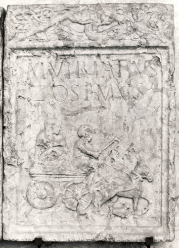 All'interno dello specchio epigrafico e al di sotto dell'iscrizione è rappresentato il defunto seduto su un carro a quattro ruote, guidato da un giovane che tiene la frusta e le redini. Tra le zampe del cavallo che tira il carro è rappresentato un cagnolino. Al di sopra dello specchio è presente un timpano corniciato da modanatura a listello piatto e decorato all'interno con due delfini contrapposti che intrecciano le code attorno ad un tridente centrale. Gli spazi acroteriali sono decorati con motivi vegetali. Specchio epigrafico con cornice modanata a cavetto. Segni di interpunzione triangliformi con vertice verso il basso.
