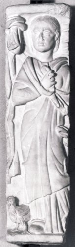 Il frammento si presenta di forma rettangolare, due listelli delimitano lo spazio figurato, nel quale è raffigurata una donna stante ritta di fronte all'osservatore e davanti ad un parapetasma. La pettinatura della figura viene portata per la prima volta da Giulia Domna (moglie di Settimio Severo). L'abbigliamento è composto da tunica e mantello, ed essa porta inoltre delle scarpe. La donna stringe la mano sinistra al petto. Nell'angolo in basso a sinistra si distingue un gallinaceo.