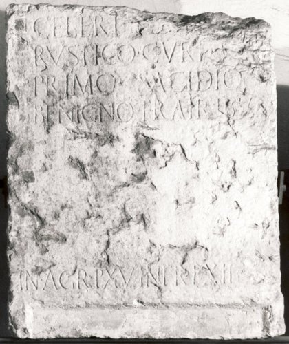 Si conosce il testo iscritto nella parte superiore mancante della stele in quanto riportato per intero in CIL V, 3514. Il testo completo con gli opportuni scioglimenti risulta: "V(iva) f(ecit) / Baebia Q(uinti) f(ilia) Secunda / sibi et Q(uinto) Baebio / M(arci) f(ilio) patri Servili/ ae Primae matri / Epidiae Q(uinti) f(iliae) Severillae / filiae Q(uinto) Baebio Se/ [---] M(arco) B[ae]bio / Celeri [M(arco) Bae]bio / Rustico Curi[atio] / Primo Sacidio / Benigno fratribus. // In agr(o) p(edes) XV, in fr(onte) p(edes) XII". Si noti che nell'indicazione di pedatura CIL V,3514 riporta erroneamente IN FR P XV pro IN FR P XII. L'iscrizione si data alla II metà del I secolo d.C. sulla base di criteri paleografici (modulo tendenzialmente allungato, apicature evidenti delle lettere).