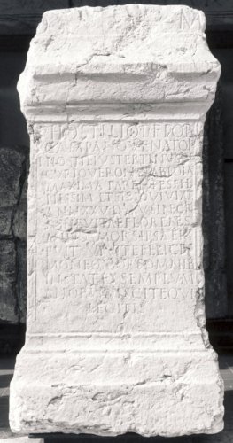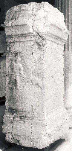 L'ara è figurata a rilievo sui lati: il lato sinistro presenta una scena di caccia al cinghiale con cacciatore nell'atto di trafiggere con una lancia le fauci di un cinghiale; sul lato destro, il cacciatore a riposo è appoggiato ad un'asta e affiancato da un cane al guinzaglio. La base ed il coronamento si raccordano al dado mediante modanatura a cavetto. Il lato superiore dell'ara ospita un foro quadrangolare (altezza cm.7 x larghezza cm.6 ca.). Il testo si caratterizza per lettere leggermente apicate e segni d'interpunzione triangoliformi con vertice verso l'alto. Presenza di lettere in nesso: r.2 RI ; r.7 NE e RI; r.8 NTE. Apice su E alla r.9.