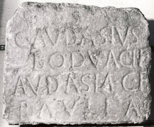 L'iscrizione si data con buona probabilità alla seconda metà del I secolo a.C., propendendo per l'ultimo quarto del secolo, sulla base dei caratteri paleografici delle lettere e, in particolar modo, delle formule onomastiche. Il testo iscritto, forse in parte mancante, menziona, in caso nominativo, la formula onomastica dei due titolari della sepoltura: C. Audasius, figlio di Baudacus, e la figlia Audasia Paulla. L'individio maschile è indicato da formula onomastica bimembre priva del cognomen e con patronimico di origine celtica espresso per esteso, Boduaci f(ilius); la formula onomastica della figlia, invece, si compone di gentilizio, derivante da quello paterno, patronimico abbreviato secondo la consuetudine dell'onomastica romana, C. f(ilia), e cognomen. La formula onomastica maschile non rispetta, invece, le consuete norme dell'onomastica romana. Pertanto, sulla base dell'onomastica, si ritiene che l'iscrizione risalga ad un periodo di non ancora compiuta romanizzazione. Ancor più precisamente, la compresenza di una formula onomastica maschile priva di cogomen e con patronimico di origine celtica, espresso per esteso e non romanizzato, e di un'onomastica femminile espressa, invece, secondo le regole del formulario romano, consente di precisare il periodo di datazione proprio nella fase di passaggio tra una processo di romanizzazione in atto e una fase di già compiuta romanizzazione, individuabile, per una zona periferica quale è il Veronese e, più in generale, la Cisalpina, verso la fine del I secolo a.C.