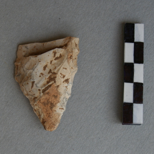 Pugnale foliato, frammento di base triangolare e piccola parte della lama, a ritocco piatto bifacciale. La sezione è a faccia piana e la faccia dorsale è in parte corticata.