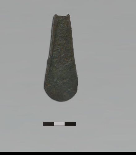ascia a margini rialzati di piccole dimensioni e di forma trapezoidale con margini rettilinei, tallone con largo incavo arcuato e taglio semicircolare