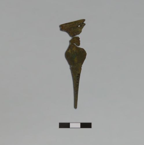 spillone con testa a profilo di clessidra appiattita, con robusta costolatura perforata posta trasversalmente sulla sommità, collo triangolare appiattito e rastremato verso il gambo, gambo a sezione ellittica